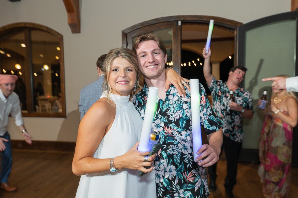 Later in the night, Ross and his groomsmen ditched their suits for matching Hawaiian shirts, and Elisabeth changed into a fun short dress. The night ended with a sparkler exit… almost without a hitch. A guest didn’t realize sparklers should go in the bucket afterward and tried to step on theirs — resulting in one very scorched shoe. (They were fine, and yes, the shoe lived to tell the tale.)